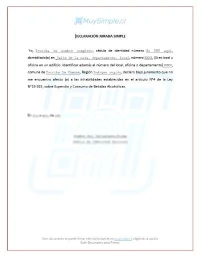 Documento que un comerciante debe presentar a la municipalidad, junto con la solicitud de patente para expender bebidas alcohólicas, en el que declara no estar afecto a las inhabilidades establecidas en el Artículo 4 de la Ley N°19.925, sobre expendio y consumo de bebidas alcohólicas. Algunos municipios en sus páginas web ofrecen formularios para hacer esta declaración.